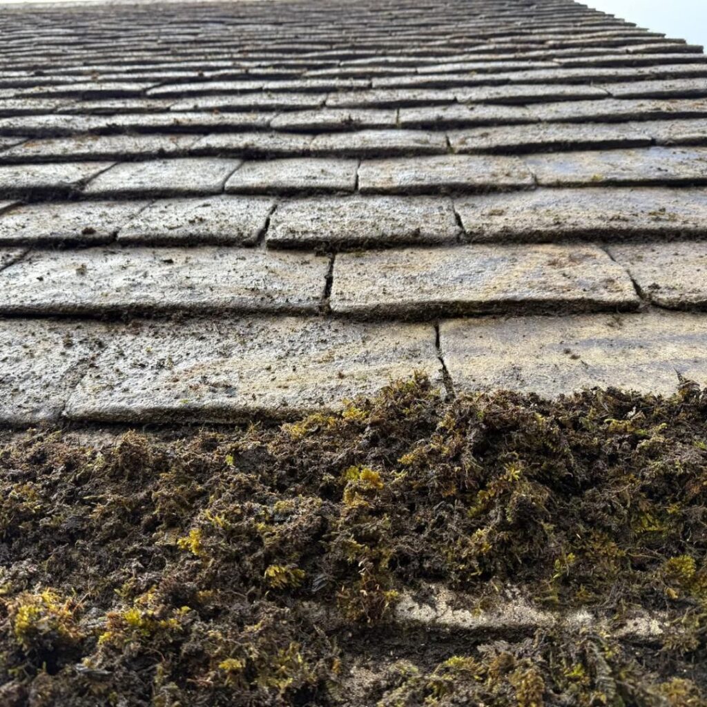 Moss removal via air scrape gently lifts moss from roof tiles using compressed air, preventing damage and keeping roofs clean and healthy.